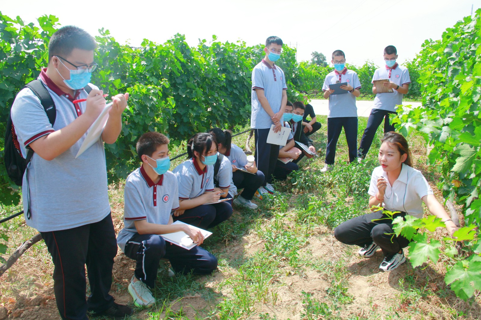 剛進(jìn)入莊園,同學(xué)們就被這里千畝葡萄園的秀美風(fēng)光吸引了,跟著講解員一起了解葡萄種植全過程以及釀酒葡萄品種等知識。